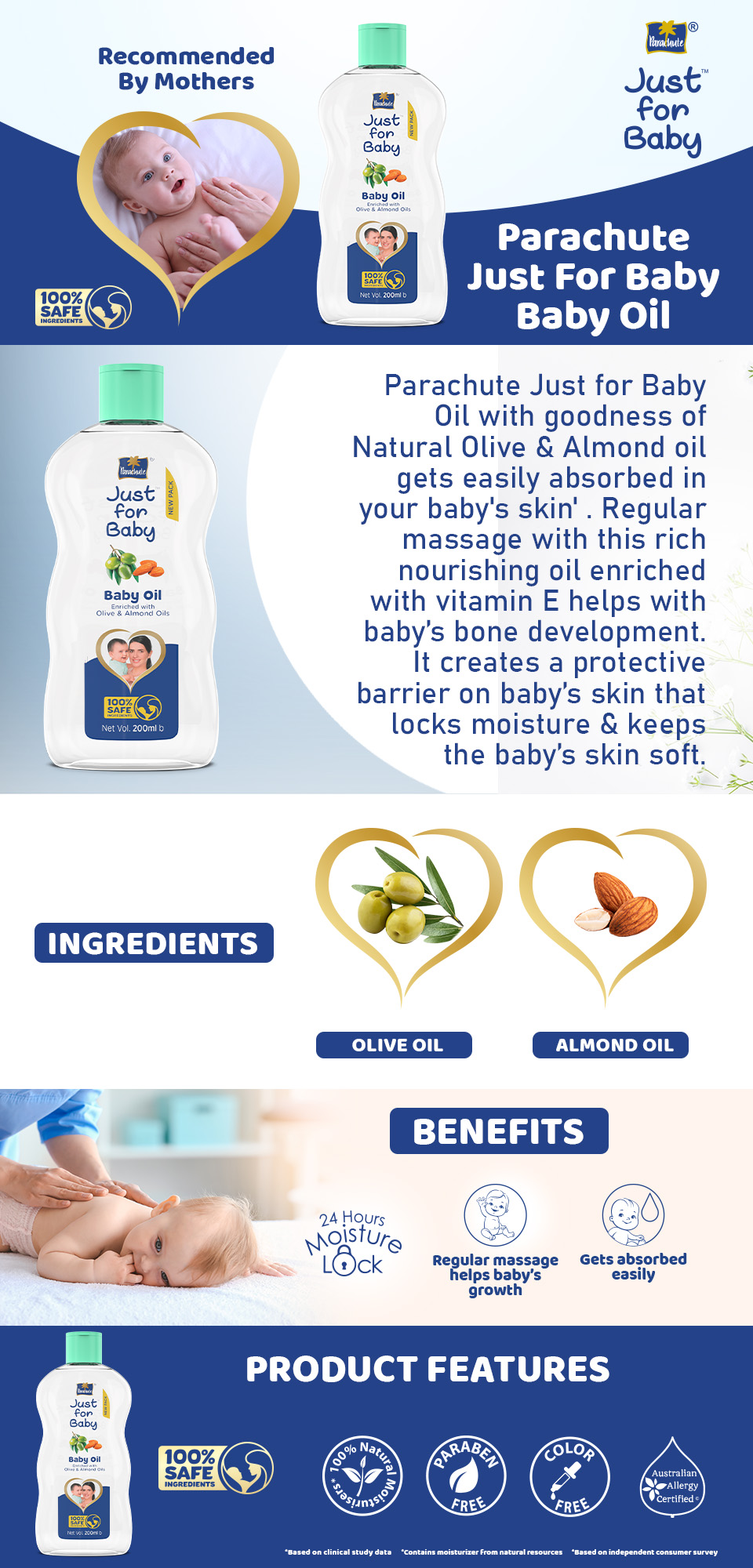 - Parachute Just for Baby care range is enriched with Paraben Free & Color Free ingredients, 100% natural moisturizers, and is Australian Allergy Certified.